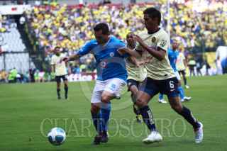 MÉXICO, D.F., 14FEBRERO2010.- Cristhian Gimenz disputa el balon con Juan Carlos Valenzuela durante el partido correspondiente de la jornada cinco del Torneo Bicentenario 2010, entre las Águilas del América y Cruz Azul, quedando un marcador final de 2-0 favor América FOTO: SÁSHENKA GUTIÉRREZ/CUARTOSCURO.COM