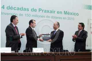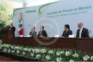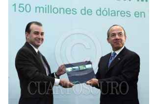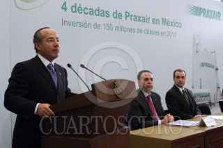 MÉXICO, D.F., 15FEBRERO2010.- Munlio Melo Barros, Presidente de Praxair y Felipe Calderón Hinojosa, Presidente de México, durante el anuncio de inversión Praxair que se llevó acabo en la residencia oficial de Los Pinos en el salón Manuel Avila Camacho. FOTO: FRANCISCO SANTOS/CUARTOSCURO.COM