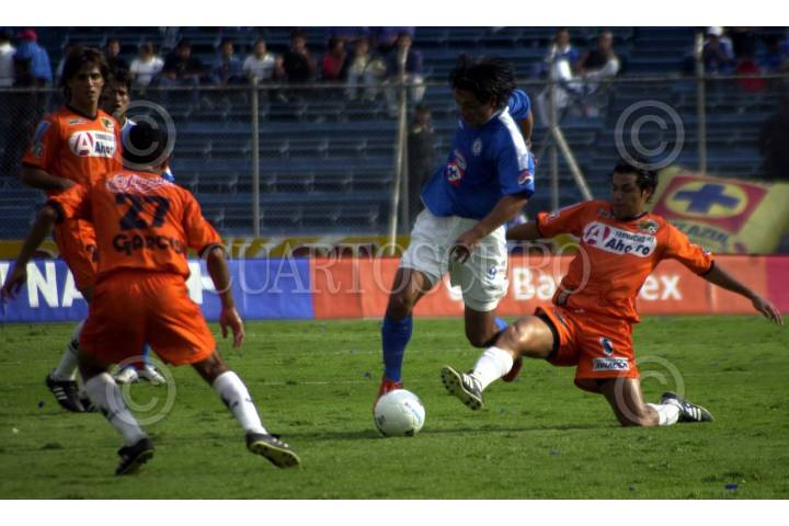 César Delgado, autor del gol de Cruz Azul, es calmado por sus compañeros luego de ser expulsado enmedio de la lluvia. La "Máquina" pierde frente a Jaguares de Chiapas con 3 goles por 1. FOTO: Juan Pablo Zamora/CUARTOSCURO.COM