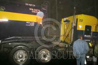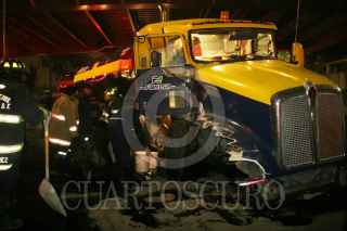 MÉXICO, D.F., 18FEBRERO2010.- Un trailer con doble contenedor se estrelló en el muro de contención de calzada de Tlalpan y Taxqueña, reventándose los tanques de diesel, provocando el cierre de las laterales con dirección al Centro por más de cuatro horas. FOTO: LUZ ACEVDO/CUARTOSCURO.COM