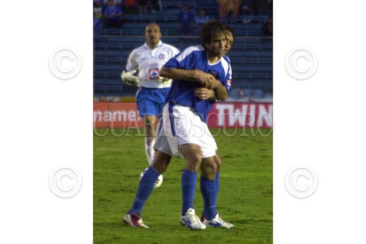 César Delgado, autor del gol de Cruz Azul, es calmado por sus compañeros luego de ser expulsado enmedio de la lluvia. La "Máquina" pierde frente a Jaguares de Chiapas con 3 goles por 1. FOTO: Juan Pablo Zamora/CUARTOSCURO.COM