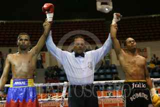 MÉXICO, D.F., 20FEBRERO2010.- La pelea del Campeonato Intercontinental Super Gallo de la Asociación Mundial de Boxeo (AMB), entre Adolfo "Cachaco" Ramos (Colombia), y Julio "La Sombra" Zárate, terminó en empate técnico, ayer por la noche en la función de box llamada "Guerra de Poderes". También se disputó el Campeonato NABA de la AMB Super Mosca. FOTO: MISAEL VALTIERRA/CUARTOSCURO.COM