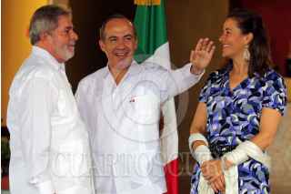 RIVERA MAYA, QUINTANA ROO, 21FEBRERO2010.- Luis Ignácio Lula da Silva, Presidente de Brasil, saluda y bromea con Felipe Calderón, Presidente de México y su esposa Margarita Zavala minutos antes de realizarse la ceremonia de inauguración de la XXI Cumbre de Río que se lleva a cabo en esta zona turística. FOTO: AMARANTA PRIETO/CUARTOSCURO.COM