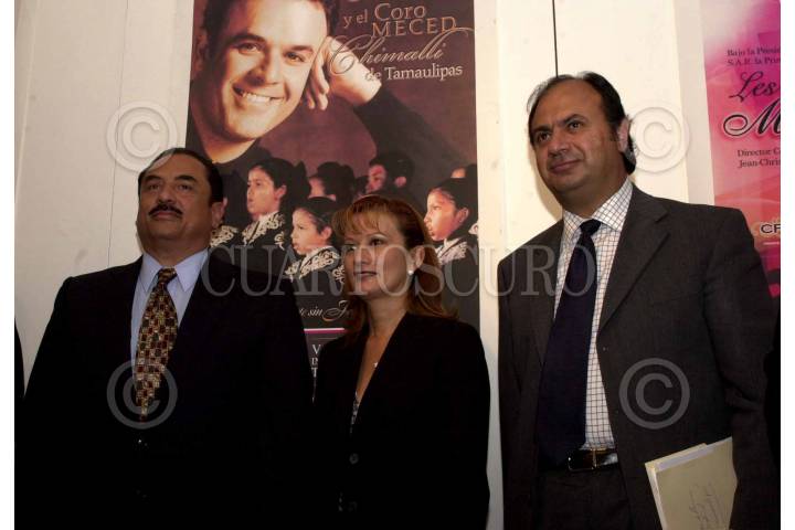 Antonio Martínez, secretario del Educación, Cultura y Deporte de Tamaulipas, la esposa del gobernador de Tamaulipas Ma. Antonieta Yarrington y Eudoro Fonseca al término de la conferencia de prensa del V Festival Internacional Tamaulipas en Bellas Artes. FOTO: Sandra Perdomo/CUARTOSCURO.COM