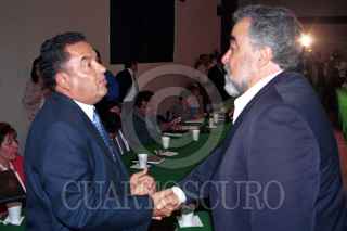 José Medel, lider de los trabajadores del gobierno del DF, saluda a Alejandro Encinas, secretario de gobierno, después de firmar el acuerdo laboral entre ambas partes. FOTO: Moisés Pablo/CUARTOSCURO.COM