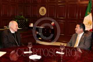 MÉXICO, D.F., 25FEBRERO2010.- Carlos Navarrete Ruiz, Presidente del Senado de la República, recibió al arzobispo Carlos Aguiar Retes, Presidente del Consejo Permanente de la Conferencia del Episcopado Mexicano. FOTO: CUARTOSCURO.COM