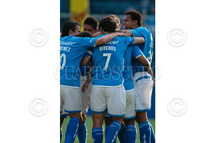 MÉXICO, D.F., 27FEBRERO2010.- Jugadores de la maquina celeste del Cruz Azul agradecen a su afición al termino del partido en contra de los zorros del Atlas; partido que ganó la maquina celeste 3 goles por 1 en el estadio Azul de la jornada 8 del torneo Bicentenario del fútbol mexicano. FOTO: RODOLFO ANGULO/CUARTOSCURO.COM
