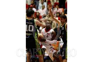 VERACRUZ, VERACRUZ, 05MARZO2010.- Ante un lleno espectacular se presencio el primer duelo en la final de la Liga Nacional de Baloncesto Profesional (LNBP) el cual se disputo en la duela del auditorio Benito Juárez de esta ciudad, Halcones Rojos Veracruz cayó ante su similar Halcones U.V Xalapa, por la mínima diferencia de 1 punto, 79 – 80 la cual le dio la ventaja a los capitalinos en esta primera fase. FOTO: FÉLIX MÁRQUEZ/CUARTOSCURO.COM