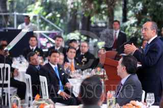 MÉXICO D.F.,05MARZO2010.- Felipe Calderon Hinojosa Presidente de México, durante el desayuno con la misión Mexicana de ayuda humanitaria que viajó a la Repíblica de Haiti el desayuno se realizó en las escalinatas de la explanada de la residencia oficial de los Pinos. FOTO: ARIEL GUTIÉRREZ/CUARTOSCURO.COM