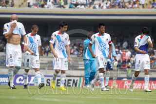 MÉXICO, D.F., 07MARZO2010.- Jugadores del Puebla salen de la cancha la ser derrotados por los Pumas de la UNAM que consiguieron su tercera victoria en casa; anotando cuatro goles y sumado 16 puntos en la fecha 9 del Torneo Bicentenario. FOTO: SÁSHENKA GUTIÉRREZ/CUARTOSCURO.COM