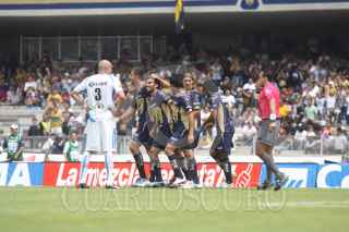 MÉXICO, D.F., 07MARZO2010.- Jugadores de los Pumas celebran su anotación de gol ante el equipo de Puebla donde el equipo de los pumas consiguió su tercera victoria en casa; anotando cuatro goles y sumado 16 puntos en la fecha 9 del Torneo Bicentenario. FOTO: SÁSHENKA GUTIÉRREZ/CUARTOSCURO.COM