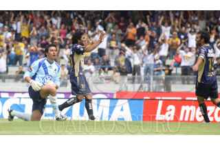 MÉXICO, D.F., 07MARZO2010.- Jugadores de los Pumas celebran su anotación de gol ante el equipo de Puebla donde el equipo de los pumas consiguió su tercera victoria en casa; anotando cuatro goles y sumado 16 puntos en la fecha 9 del Torneo Bicentenario. FOTO: SÁSHENKA GUTIÉRREZ/CUARTOSCURO.COM