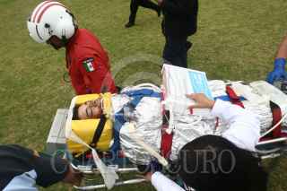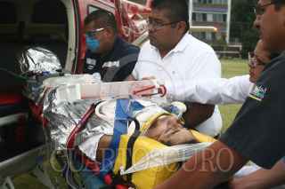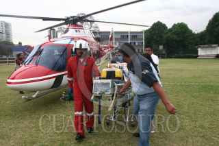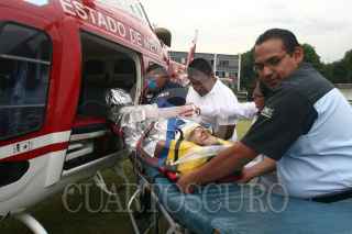 MÉXICO, D.F. 08MARZO2010.- Paramedicos del escuadrón "Relámpagos" trasladaron en helicóptero del municipio de Texcoco hacia el Distrito Federal a Roberto Segura Aguilar de 34 años de edad después que resultó lesionado al explotarle un polvorín en la comunidad de Vicente Riva Palacio.. FOTO: SAÚL LÓPEZ/CUARTOSCURO.COM