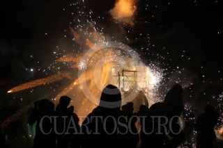 TULTEPEC, ESTADO DE MÉXICO 09MARZO2010.- Del 6 al 15 de Marzo se realiza en Tultepec la feria de la pirotécnia, teniedo diversas actividades relacionados con los juegos artificiales. La noche de ayer, los habitantes del lugar festejaron a San Juan de Dios, patrono de los pirotécnicos, por lo que fueron quemados más de cien “toritos” en una actividad llamada "pamplonada pirotecnica", donde cientos de jóvenes se dan cita en la en la plaza municipal para brincar alrededor de las luces de artificio que son expulsadas de los "toritos". Las personas que acuden a esta festividad suman los 100 mil visitantes. FOTO: SÁSHENKA GUTIÉRREZ/CUARTOSCURO.COM