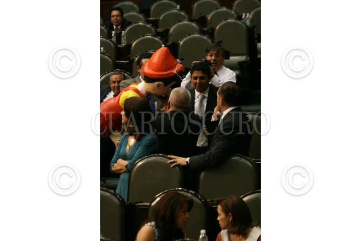 MÉXICO D.F., 09MARZO2010.- María Estela de la Fuente, Diputada del PRI, coloco una piñata con la figura de pincho equivocadamente detrás de Francisco Rojas coordinador de esta bancada y de Beatriz Paredes Rangel, presidenta nacional del PRI, ya que sería colocada en el lugar del diputado y dirigente del PAN, César Nava, esto cuando debatía sobre el convenio que se firmo entre los dirigentes del PRI y del PAN. Camilo Ramírez Puentes, Diputado del PAN, saca la piñata de pinocho del salón de plenos. FOTO: GUILLERMO PEREA/CUARTOSCURO.COM
