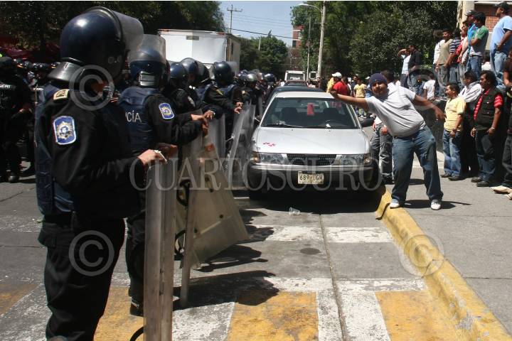 MÉXICO, D.F., 11MARZO2010.- Vendedores ambulantes lanzaron rocas al termino del operativo que que elementos de la Policía Federal, SSP-DF, SAT y de la procuraduria del Distrito Federal, realizaron en un mercado sobre ruedas en contra de ropa pirata en la Unidad Habitacional Santa Fe en la delegación Alvaro Obregón. FOTO: SAÚL LÓPEZ/CUARTOSCURO.COM