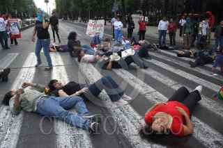 MÉXICO, D.F., 13MARZO2010.- Madres, amigos y familiares de los jóvenes que han muerto en ciudad Juárez se manifestaron a las afueras de la PGR, al no ser recibidos por alguna autoridad caminaron a la columna del ángel de la Independencia donde realizaron se acostaron simulando que eran ejecutados, cerrando la circulación creando un caos vial. FOTO: SÁSHENKA GUTIÉRREZ/CUARTOSCURO.COM