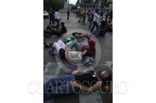 MÉXICO, D.F., 13MARZO2010.- Madres, amigos y familiares de los jóvenes que han muerto en ciudad Juárez se manifestaron a las afueras de la PGR, al no ser recibidos por alguna autoridad caminaron a la columna del ángel de la Independencia donde realizaron se acostaron simulando que eran ejecutados, cerrando la circulación creando un caos vial. FOTO: SÁSHENKA GUTIERREZ/CUARTOSCURO.COM