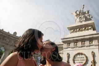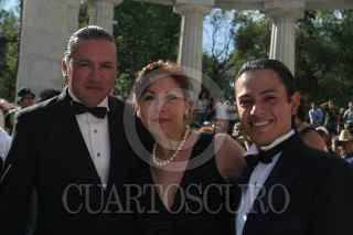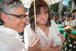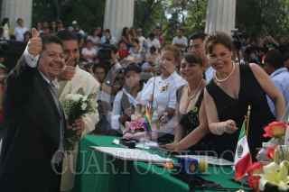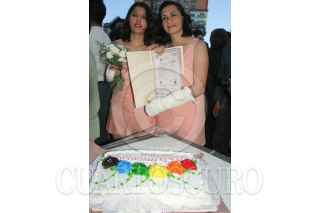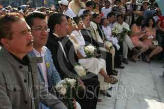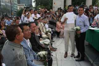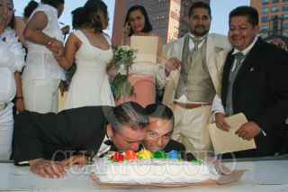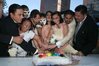 MÉXICO, D.F., 14MARZO2010.- Las nueve parejas que se casaron en la primer boda colectiva lesbico-gay en el Hemiciclo a Juárez donde al termino de la ceremonia, partieron un pastel como parte de los festejos tras haber contraído nupcias. FOTO: ENRIQUE ORDÓÑEZ/CUARTOSCURO.COM