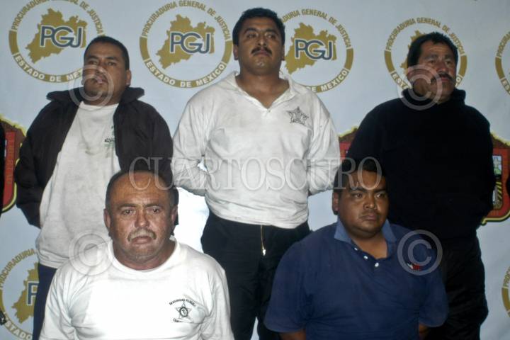 TOLUCA, ESTADO DE MÉXICO, 15MARZO2010.- En conferencia de prensa la PGJEM dió a conocer sobre la detención de cinco policías municipales y uno más que se encuentra prófugo, los cuales tienen 11 homicidios en su haber en municipios como Tultepec, Tultitlan, Cuautitlan Izcalli y Cuautitlan México, contra hombres que circulaban solos a los que despojaban de sus pertenencias y los ejecutaban en sus autos. FOTO: LUIS CARBAYO/CUARTOSCURO.COM