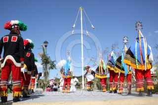 PAPANTLA, VERACRUZ, 21MARZO2010.-Ceremonia Ritual de la Danza de los Voladores quienes 2009 La UNESCO reconoció a la Ceremonia Ritual de Voladores como Patrimonio Cultural Intangible de la Humanidad. Esta danza prehispánica con mas de 2500 años de antiguedad gira en torno al arbol o palo del volador considerado el axis mundi transmisor entre el inframundo, la Tierra y el Cosmos; esto se presenta como parte de las actividades Cumbre Tajín 2010. FOTO: SÁSHENKA GUTIÉRREZ/CUARTOSCURO.COM