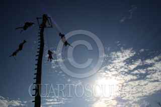 PAPANTLA, VERACRUZ, 21MARZO2010.-Ceremonia Ritual de la Danza de los Voladores quienes 2009 La UNESCO reconoció a la Ceremonia Ritual de Voladores como Patrimonio Cultural Intangible de la Humanidad. Esta danza prehispánica con mas de 2500 años de antiguedad gira en torno al arbol o palo del volador considerado el axis mundi transmisor entre el inframundo, la Tierra y el Cosmos; esto se presenta como parte de las actividades Cumbre Tajín 2010. FOTO: SÁSHENKA GUTIÉRREZ/CUARTOSCURO.COM