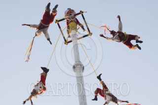 PAPANTLA, VERACRUZ, 21MARZO2010.-Ceremonia Ritual de la Danza de los Voladores quienes 2009 La UNESCO reconoció a la Ceremonia Ritual de Voladores como Patrimonio Cultural Intangible de la Humanidad. Esta danza prehispánica con mas de 2500 años de antiguedad gira en torno al arbol o palo del volador considerado el axis mundi transmisor entre el inframundo, la Tierra y el Cosmos; esto se presenta como parte de las actividades Cumbre Tajín 2010. FOTO: SÁSHENKA GUTIÉRREZ/CUARTOSCURO.COM