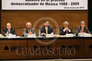 MÉXICO, D.F., 25MARZO2010.- Marco Antonio Baños Martínez, consejero, Fernando Ojesto Martínez, Leonardo Valdés Zurita, consejero presidente, Luis Molina Piñeiro y Macarita Elizondo Gasperín, consejera, durante la presentación del libro: “Monitor Democrático, Balance en el Proceso Democratizador de México 1988-2009”, esto en la sede del IFE. FOTO: CUARTOSCURO.COM