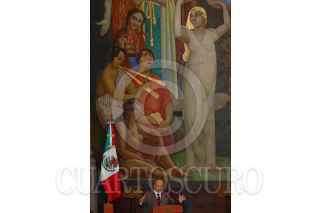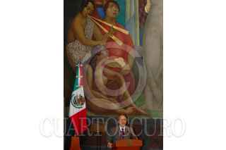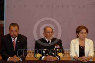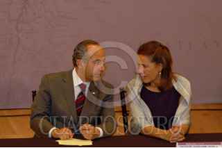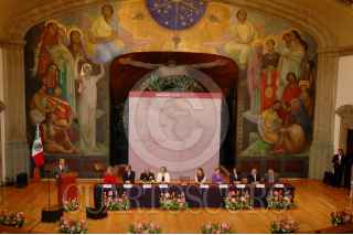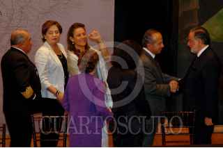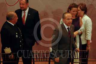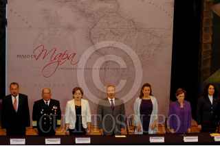 MÉXICO D.F., 25MARZO2010.- Francisco Saynez, secretario de Marina; Patricia Espinoza, secretaria de Relaciones Exteriores; Margarita Zavala, el presidente Felipe Calderon y Germán Guerrero, embajador de Chile en México al termino del evento de inauguración de la exposición "Paseo en Mapa. Explorando las Claves de America Latina" que se realizo en el Antiguo Colegio de San Ildefonso. FOTO: RODOLFO ANGULO/CUARTOSCURO.COM