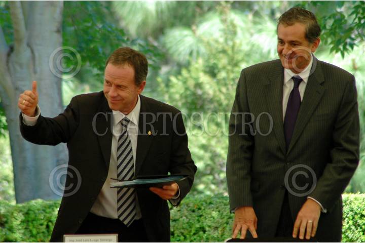 MÉXICO, D.F., 26MARZO2010.- José Guadalupe Osuna Millán, gobernador de Baja California; José Luis Luege Tamargo, director de Conagua y el presidente Felipe Calderón durante la presentación de la Agenda del Agua 2030 que se realizo en la Explanada del Monumento a Francisco I. Madero de la residencia oficial de Los Pinos. FOTO: RODOLFO ANGULO/CUARTOSCURO.COM