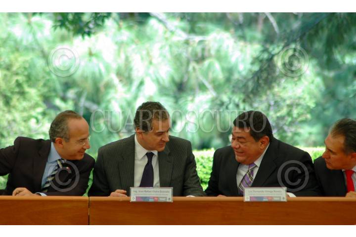 MÉXICO, D.F., 26MARZO2010.- José Guadalupe Osuna Millán, gobernador de Baja California; José Luis Luege Tamargo, director de Conagua y el presidente Felipe Calderón durante la presentación de la Agenda del Agua 2030 que se realizo en la Explanada del Monumento a Francisco I. Madero de la residencia oficial de Los Pinos. FOTO: RODOLFO ANGULO/CUARTOSCURO.COM