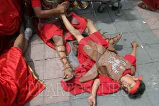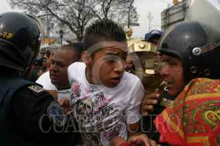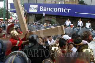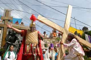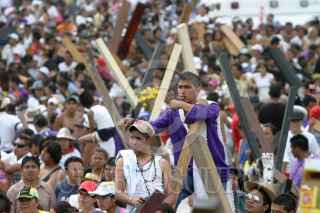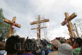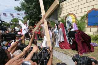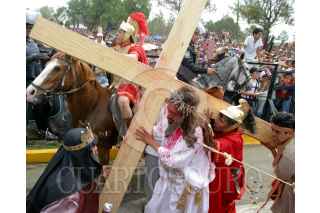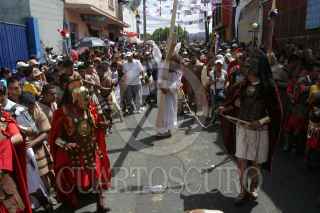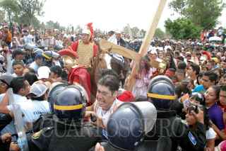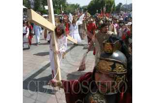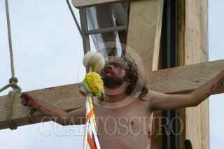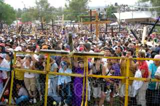 MÉXICO, D.F., 02ABRIL2010.- La representación de la Pasión de Cristo en Iztapalapa se llevó a cabo en su edición 167 en la cual Jesús de Nazareth, personificado por Francisco Gerardo Serrano de 32 años y originario del barrio de Santa Bárbara, recorrió la vía dolorosa rumbo al gólgota ubicado en el Cerro de la Estrella. El nazareno fue crucificado alrededor de las 16:30, una hora más tarde de lo previsto, ante la presencia de Un millón doscientas mil personas según datos estimados por autoridades de la delegación. FOTO: MOISÉS PABLO/CUARTOSCURO.COM