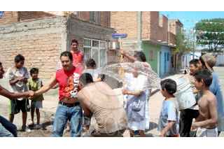 MÉXICO, D.F., 03ABRIL2010.- Poco les importo algunos vecinos del centro las multas que van de 21 a 30 salarios mínimos por desperdiciar el agua en este Sábado de Gloria y se divirtieron arrojándose el vital líquido para refrescarse del intenso calor que se dejo sentir en la capital. FOTO: MOISÉS PABLO/CUARTOSCURO.COM