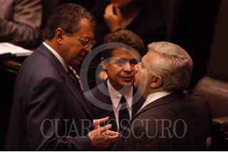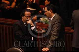 Los ex consejeros electorales y ahora diputados federales Juan Molinar Horcasitas (PAN) conversa con Emilio Zebadua (PRD) durante la sesión de la cámara de diputados. FOTO: Germán Romero/CUARTOSCURO.COM