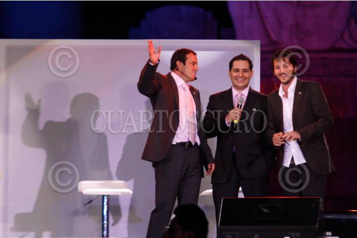 MÉXICO D.F., 05ABRIL2010.- Cuauhtémoc Blanco, futbolista y conductor del programa de televisión ¨La hora de Cuauhtémoc¨, fue nombrado embajador turístico y deportivo de la capital. Aquí con el conductor Gustavo Mendoza y el actor Diego Luna. FOTO: IVÁN STEPHENS/CUARTOSCURO.COM