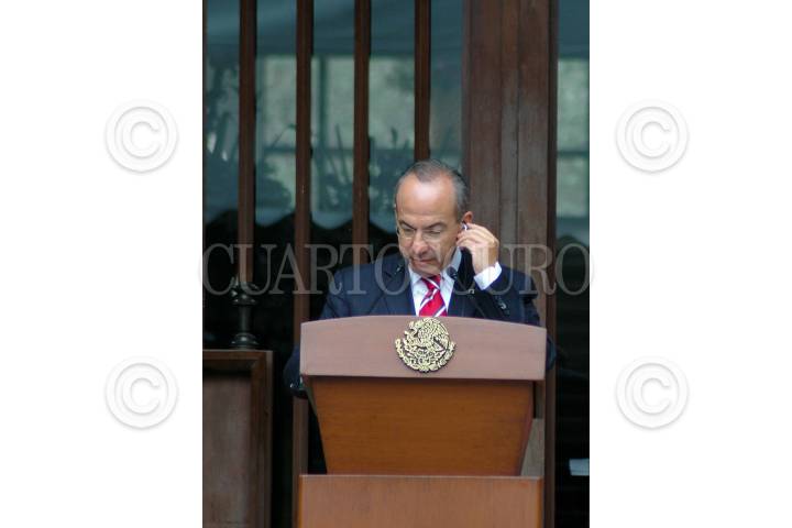 MÉXICO, D.F., 09ABRIL2010.- El primer ministro de Noruega Jens Stoltenberg y el presidente Felipe Calderón al termino de un mensaje que ofrecieron a los medios de comunicación en las escalinatas de la residencia oficial de Los Pinos. FOTO: RODOLFO ANGULO/CUARTOSCURO.COM