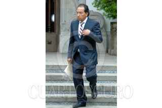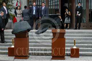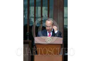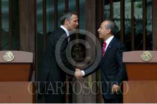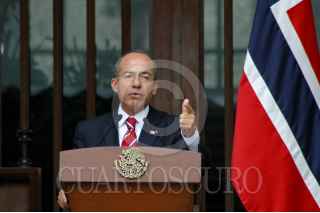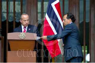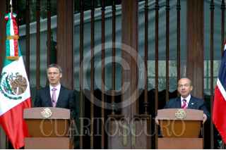 MÉXICO, D.F., 09ABRIL2010.- El primer ministro de Noruega Jens Stoltenberg y el presidente Felipe Calderón al termino de un mensaje que ofrecieron a los medios de comunicación en las escalinatas de la residencia oficial de Los Pinos. FOTO: RODOLFO ANGULO/CUARTOSCURO.COM