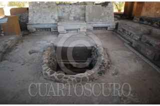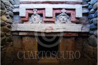 OAXACA, OAXACA, 12ABRIL2010.- Representaciones en Estuco del Señor 1 Temblor y la Señora 10 Caña, los cuales tienen una antigüedad de 1,300 años. Uno de los pocos ejemplares de retratos de gobernantes prehispánicos, dispuesto en la fachada de la Tumba 6 del sitio arqueológico de Lambityeco, en Oaxaca, fue restaurado por especialistas del Instituto Nacional de Antropología e Historia (INAH-Conaculta). Se trata de la representación del señor 1 Temblor y la señora 10 Caña, creada hace más de 1,300 años. Fue así como arqueólogos y restauradores del programa Corredor Arqueológico del Valle de Oaxaca (CAVO), dependiente de la Zona Arqueológica de Monte Albán, se dieron a la tarea de restituir la estabilidad de la parte exterior de esta cripta familiar, que fue descubierta a fines de los años 60 por el experto John Paddock, convirtiéndose en un hallazgo sin precedentes por sus elementos arquitectónicos, que están decorados con mosaicos y frisos en estuco. FOTO: DMC/INAH/HÉCTOR MONTAÑO/CUARTOSCURO.COM
