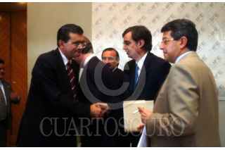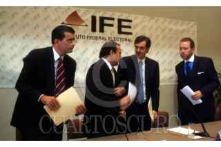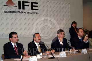 Los consejeros electorales Alonso Lujambio, José Woldenberg y Mauricio Merino se despiden luego de la conferencia realizada en el Instituto Federal Electoral. FOTO: Eunice Adorno/CUARTOSCURO.COM