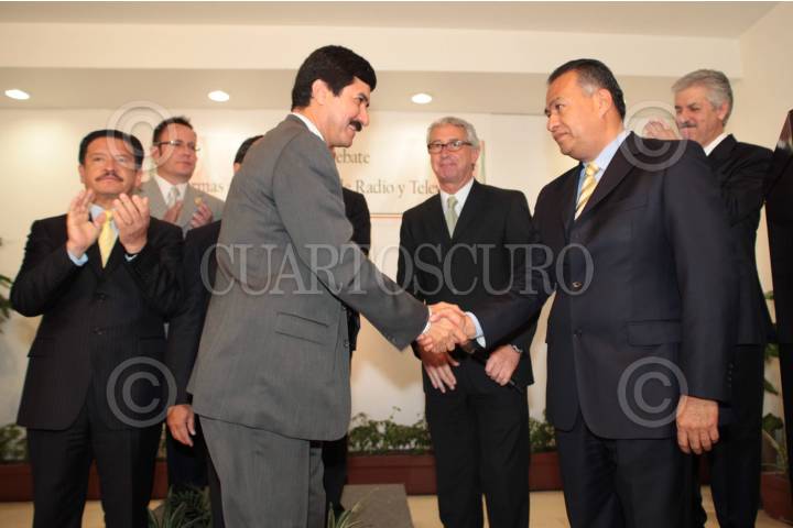 MÉXICO D.F., 14ABRIL2010.- El diputado del PAN Javier Corral conversa con el periodista Javier Solorzono y los senadores del PRD Carlos Sotelo García y Carlos Navarrete despues de posponer un debate que sería hoy, entre el panista Javier Corral y el perredista Carlos Sotelo, sobre la ley de medios en donde se revisarían diversas iniciativas para reformar la Ley Federal de Radio y Televisión, con el objetivo de avanzar hacia una reforma que permita que en México exista un modelo democrático de comunicación desde los medios electrónicos. FOTO: CUARTOSCURO.COM