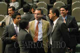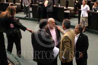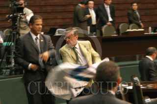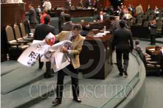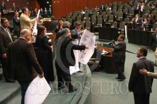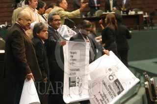MÉXICO D.F., 13ABRIL2009.- Diputado del PT y del PRD, se molestaron al momento en que Pablo Rodríguez, José Antonio Arámbula y Juan Huerta, diputados del PAN, quitaran y rompieran los carteles que colocaron en la tribuna durante la comparecencia del secretario de hacienda, por lo cual durante tomaron de forma significativa la tribuna, y colocaron carteles con una caricatura del ejecutivo con la leyenda “ Para que la droga no llegue a tus hijos… los estamos matando” esto hasta que el diputado del PAN pidió una disculpa por lo ocurrido y los diputados del PT y PRD, se retiraran de la tribuna. FOTO: GUILLERMO PEREA/CUARTOSCURO.COM