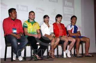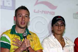 BOCA DEL RIO, VERACRUZ, 15ABRIL2010.- Los clavadistas, Mathew Mitcham, Paola Espinosa, Wu Minxia y Tomas Daley, ofrecieron una conferencia ante los medios de comunicación previo a su participación dentro de la serie mundial de clavados FINA/Li-NIng 2010, a celebrarse los días 16 y 17 del presente en el centro acuático leyes de reforma de esta ciudad. FOTO: JOSE CANDELARIO/CUARTOSCURO.COM