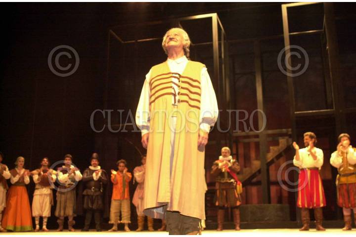 La actríz Ofelia Guilmain festeja a uno de los primeros actores de México, Ignacio López Tarso, durante homenaje sorprese realizado al término de la primera presentación de la obra El Alcalde de Zalmea, en el Teatro Jiménez Rueda. FOTO: Sandra Perdomo/CUARTOSCURO.COM