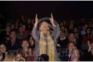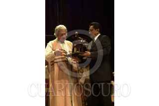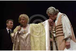 La actríz Ofelia Guilmain festeja a uno de los primeros actores de México, Ignacio López Tarso, durante homenaje sorprese realizado al término de la primera presentación de la obra El Alcalde de Zalmea, en el Teatro Jiménez Rueda. FOTO: Sandra Perdomo/CUARTOSCURO.COM