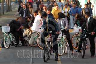 MÉXICO, D.F., 16ABRIL2010.- Un elemento de seguridad del jefe de Gobierno capitalino cayó de su bicicleta y ocasionó que la titular del Medio Ambiente local, Martha Delgado, perdiera el equilibrio, durante la inauguración de la primera ciclovía de Azcapotzalco. FOTO: ESPECIAL/CUARTOSCURO.COM