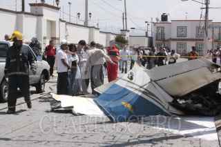 PACHUCA, HIDALGO, 17ABRIL2010.- Dos personas muertas y una más lesionada fue el saldo que arrojo el desplome de una avioneta en la ciudad de Pachuca, confirmaron fuentes de Seguridad Pública de esta ciudad. En los hechos se vio involucrada una avioneta tipo Cesna, con serial WOV, con logotipos de la escuela de aviación Aeropacífico A.C, la cual se desplomó en las inmediaciones de la colonia Pitahayas, de Pachuca. De acuerdo con los reportes la aeronave había salido procedente del puerto de Acapulco, Guerrero, cuando habría presentado fallas, ante lo cual el piloto intentó realizar una maniobra para consumar un aterrizaje forzoso, alrededor de las 10:30 horas de hoy. No obstante, la aeronave no logró librar el cableado eléctrico, tras lo cual sobrevino el desplome en el fraccionamiento El Carruaje, en la calle Privada Hacienda Concepción, entre las calles de San Pedro Baqueria y Tecajete. FOTO: MANUEL SALGADO/CUARTOSCURO.COM