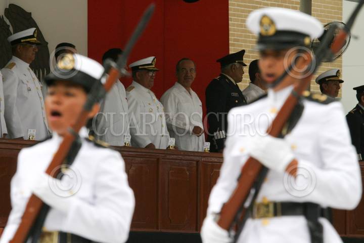 ANTÓN LIZARDO, VERACRUZ; 21ABRIL2010.- Felipe Calderón Hinojosa Presidente de México, acompañado de Genaro García Luna, Secretario de Seguridad, Fidel Herrera Beltrán, Gobernador de esta entidad, Francisco Zaynes Mendoza, Secretario de la Amada de México, Guillermo Galván Galván, Secretario de la Defensa Nacional y de Fernando Gómez Mont, titular de Gobernación, encabezo la ceremonia conmemorativa del 96 Aniversario de la Defensa del Puerto de Veracruz y la Jura de Bandera de los cadetes de la Heroica Escuela Naval Militar. Una cadete es felicitada por su familia al termino de la ceremonia. FOTO: GUILLERMO PEREA /CUARTOSCURO.COM