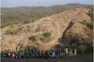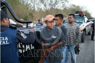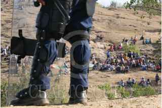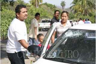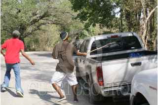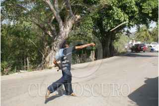 ACAPULCO, GUERRERO, 28ABRIL2010.- En medio de un dispositivo de seguridad y en un terreno cercado de la comunidad de la concepción fue aprobada por una minoría de comuneros la construcción del proyecto de la hidroeléctrica La Parota en Guerrero. A las 9:15 horas, un grupo de inconformes solicitó a las fuerzas de seguridad les dieran acceso a la asamblea y que se retirarán los policías municipales, estatales, antimotines y ministeriales, sin embargo no accedieron. Mientras tanto, unos 450 comuneros participaron en la sesión en la cual se aprobó expropiar mil 300 hectáreas y el cambio de uso del suelo del proyecto del pasado sexenio del Gobierno federal de Vicente Fox. Tras observar que al lugar acudió gente ajena a los Bienes Comunales indígenas de Cacahuatepec los manifestantes comenzaron a perseguirlos y agredirlos con piedras y palos, por lo que muchos de ellos que llegaron en taxis se retiraron del lugar. FOTO: BERNARDINO HERNÁNDEZ/CUARTOSCURO.COM