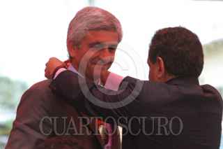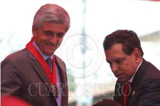 CAMARON DE TEJEDA, VERACRUZ, 30ABRIL, 2010.- Fidel Herrera Beltral, gobernador del estado de Veracruz, le otorgó la medalla conmemorativa a Herve Morin, ministro de defensa de Francia al termino de la ceremonia de la conmemoración del CXLVII aniversario de la batalla de Camarón. FOTO: SAÚL LÓPEZ/CUARTOSCURO.COM