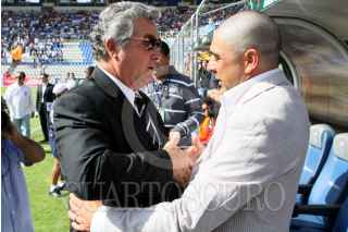 PACHUCA, PACHUCA, 01MAYO2010.- Victor Manuel Vucetich, director técnico de los Rayados del Monterrey saluda a Guillermo Daniel Rivarola director técnico de los Tuzos del Pachuca previo al partido de ida de cuartos de final del Torneo Bicentenario que se realizo en esta ciudad. Los Tuzos ganaron 1 gol por 0 a los Rayados. FOTO: RODOLFO ANGULO/CUARTOSCURO.COM